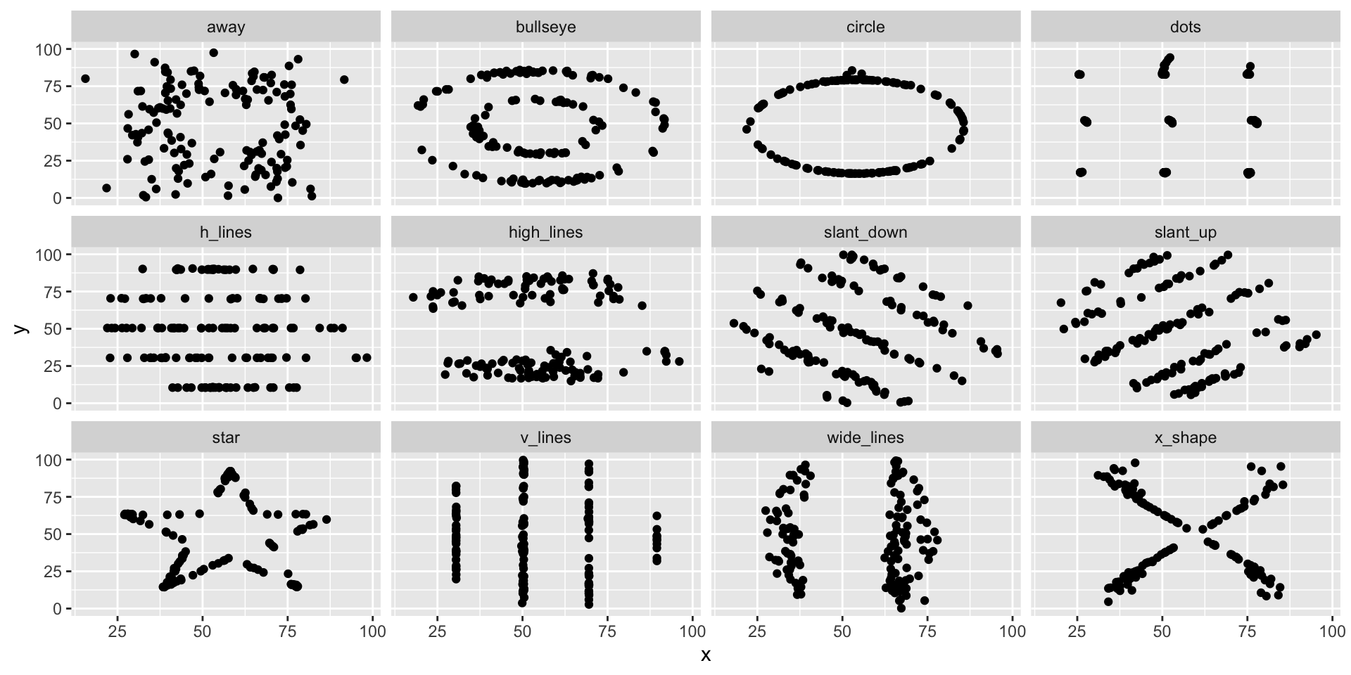 ggplot2All of these datasets have the same means for x and y, and (approximately) the same correlation: