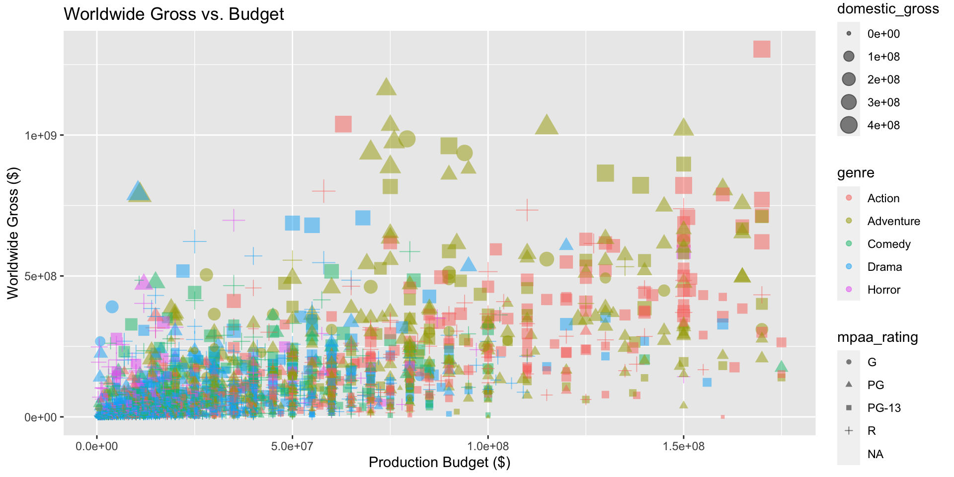 geom_point()).x, y, color, shape, size). Not all aesthetics are available for all geometries.Be sure to avoid making your visualization overly complicated: