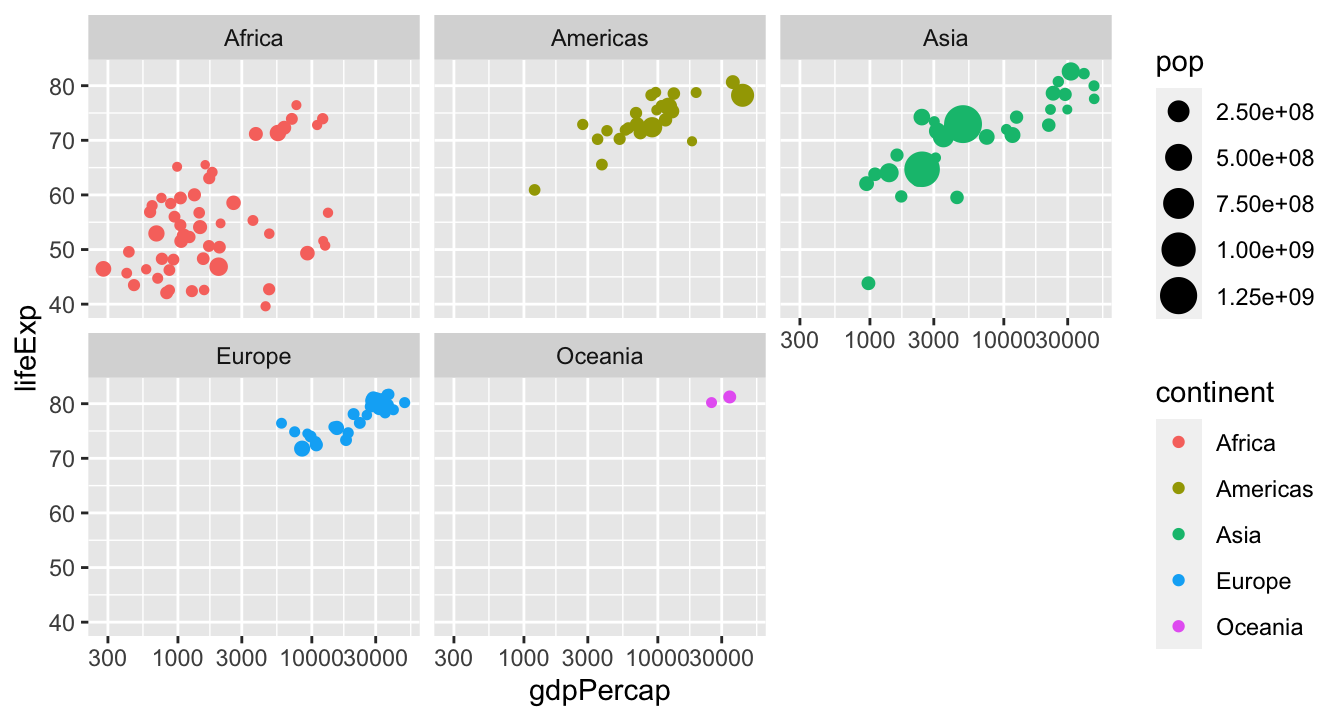 Small multiples are implemented in ggplot2 via the facet_wrap() and facet_grid() functions:
