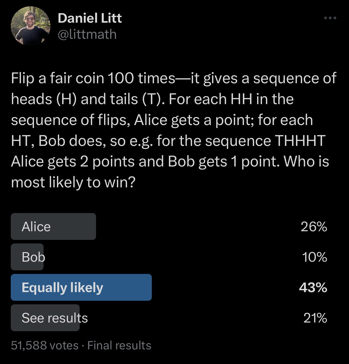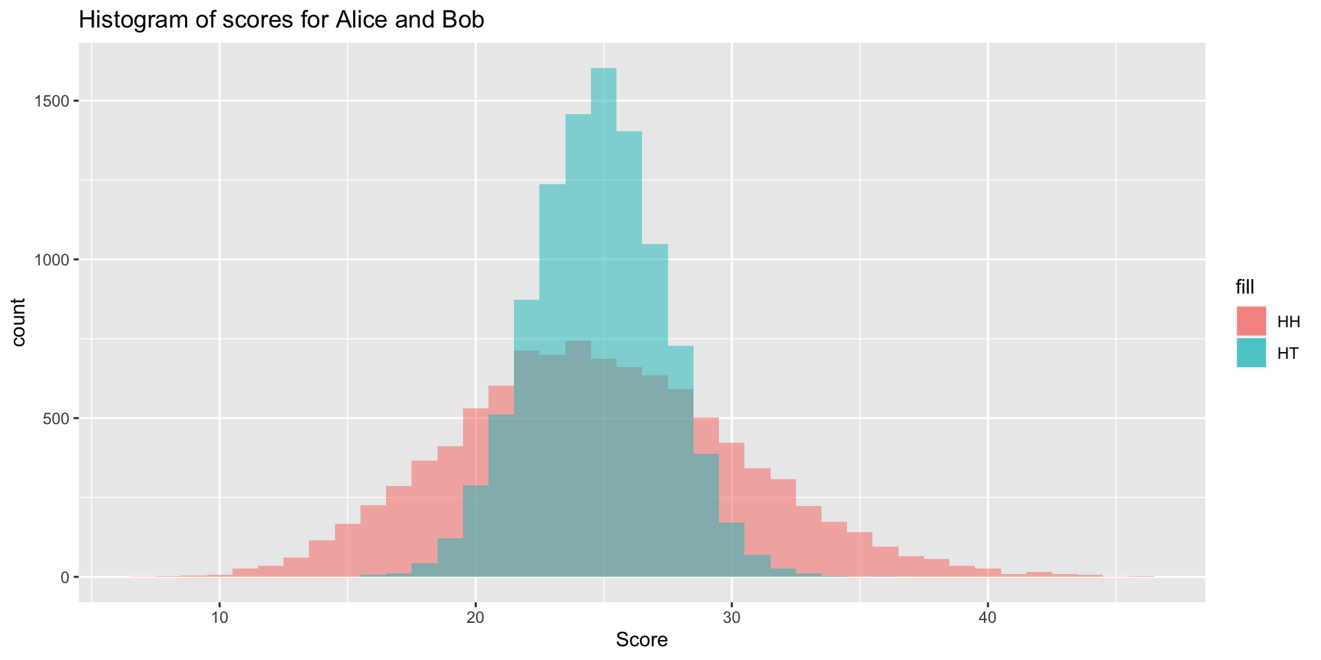 HT_scores <- sapply(results, function(x) x$HT)Why does Bob win more often? Intuitively, both “HH” and “HT” are equally likely when we flip a fair coin twice.