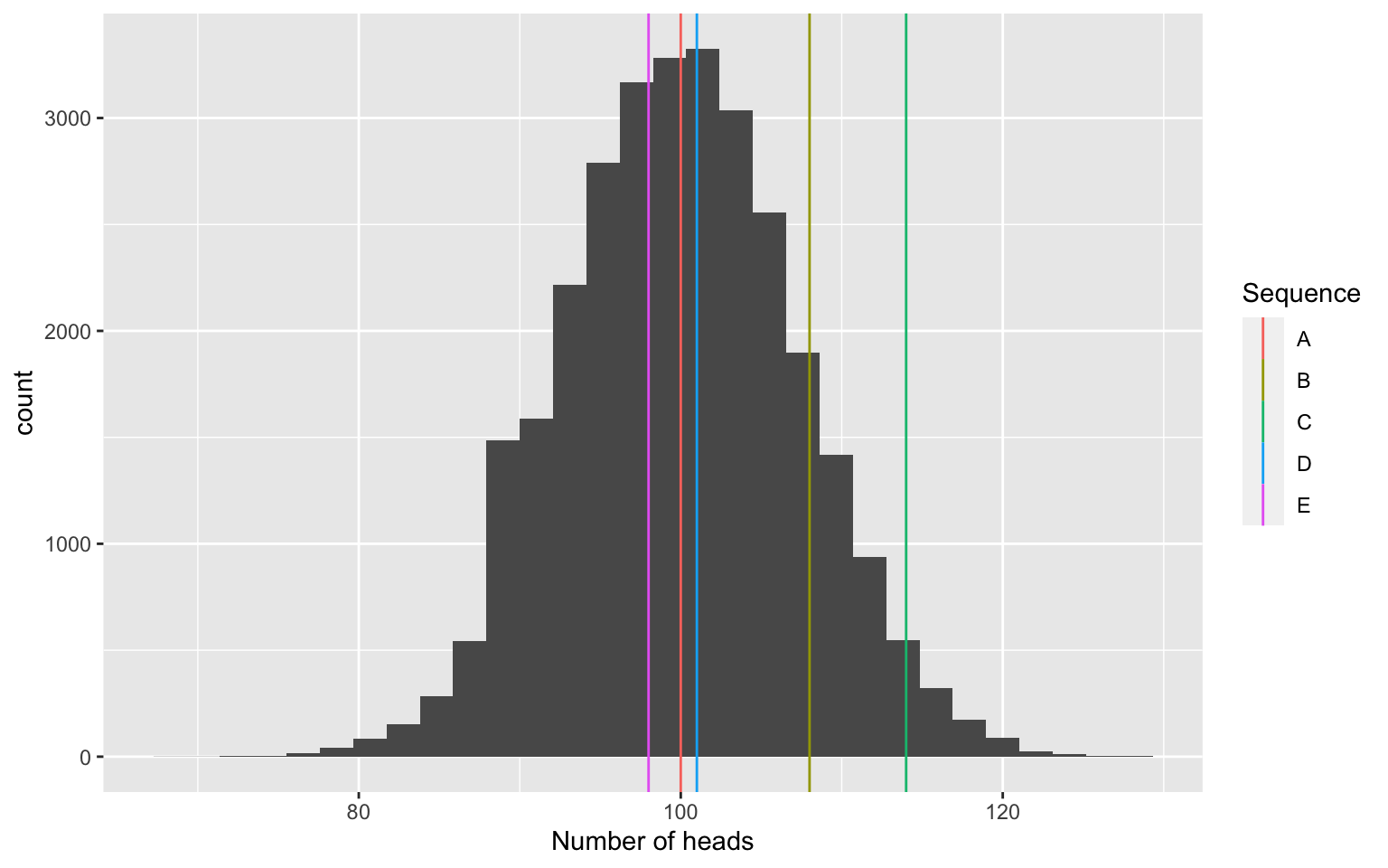 What are the test statistics for each of our sequences? One option is to use the total number of heads.