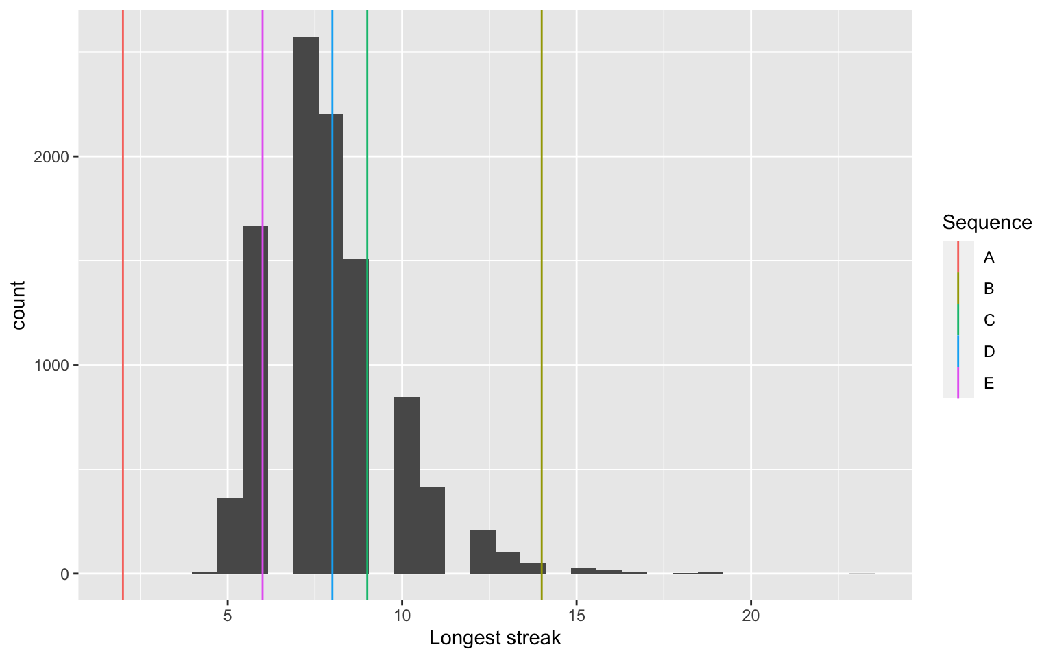 This suggests that the longest streaks are too long for sequence B. Note that we could try other test statistics. What about average streak length?