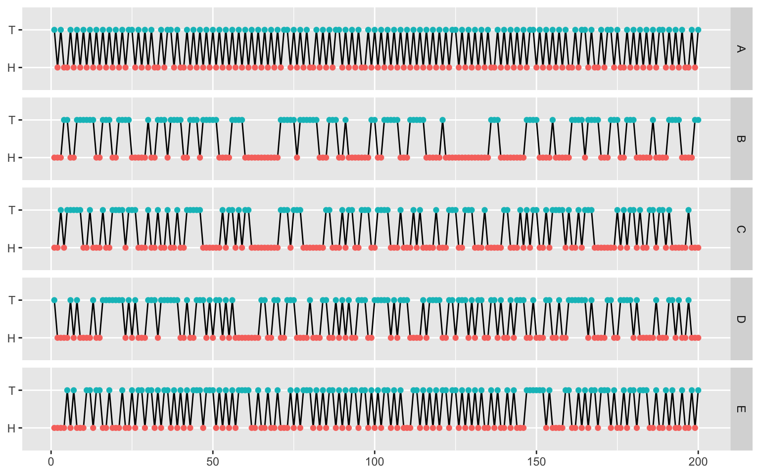 Only one sequence is generated by flipping a fair coin, using the code sample(c("H", "T"), 200, replace = T).