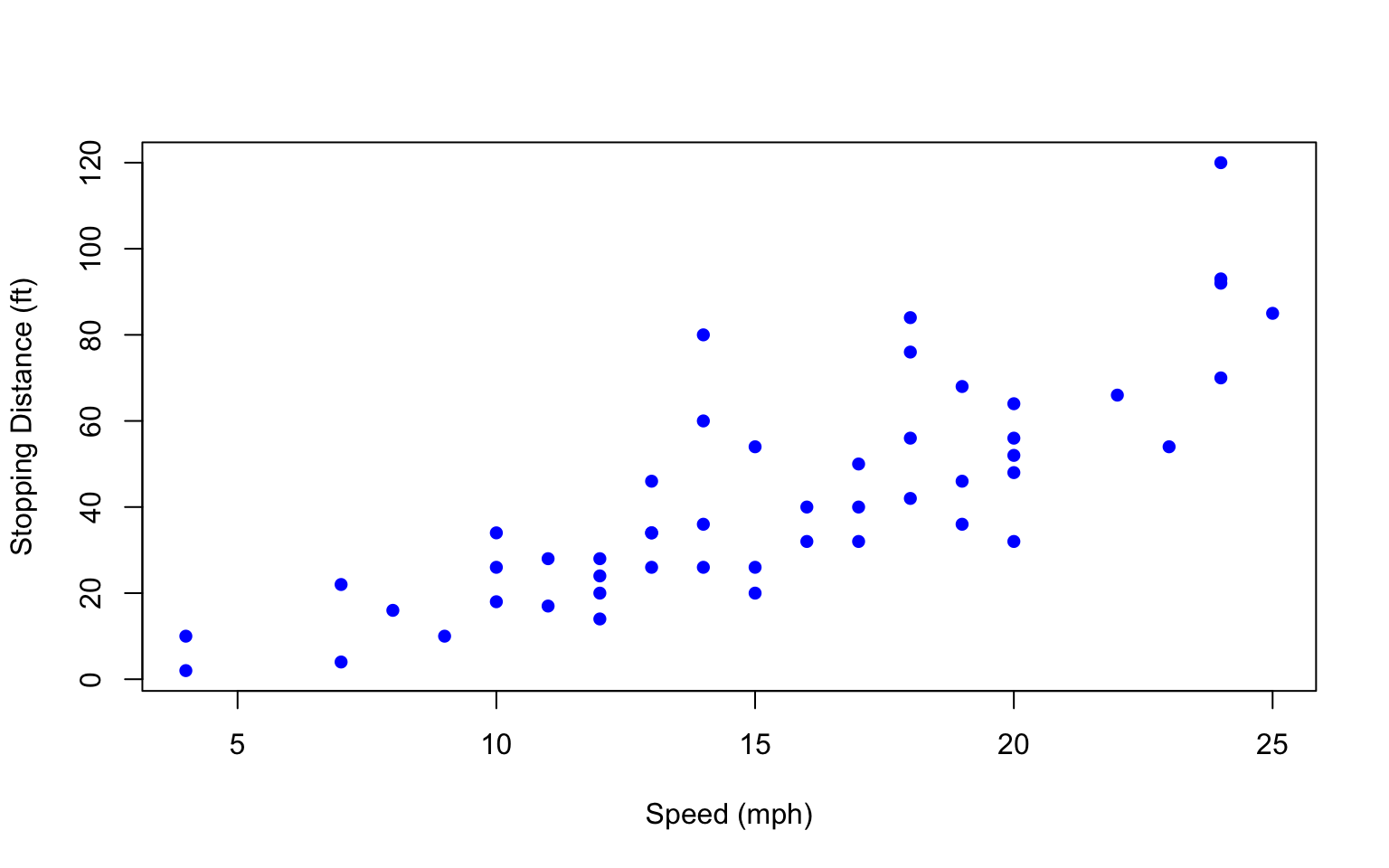 Suppose \(x_1,\ldots, x_n\) represent the speed values of each car in our dataset. Let \(Y_1,\ldots, Y_n\) represent the dist variable.