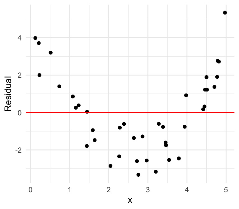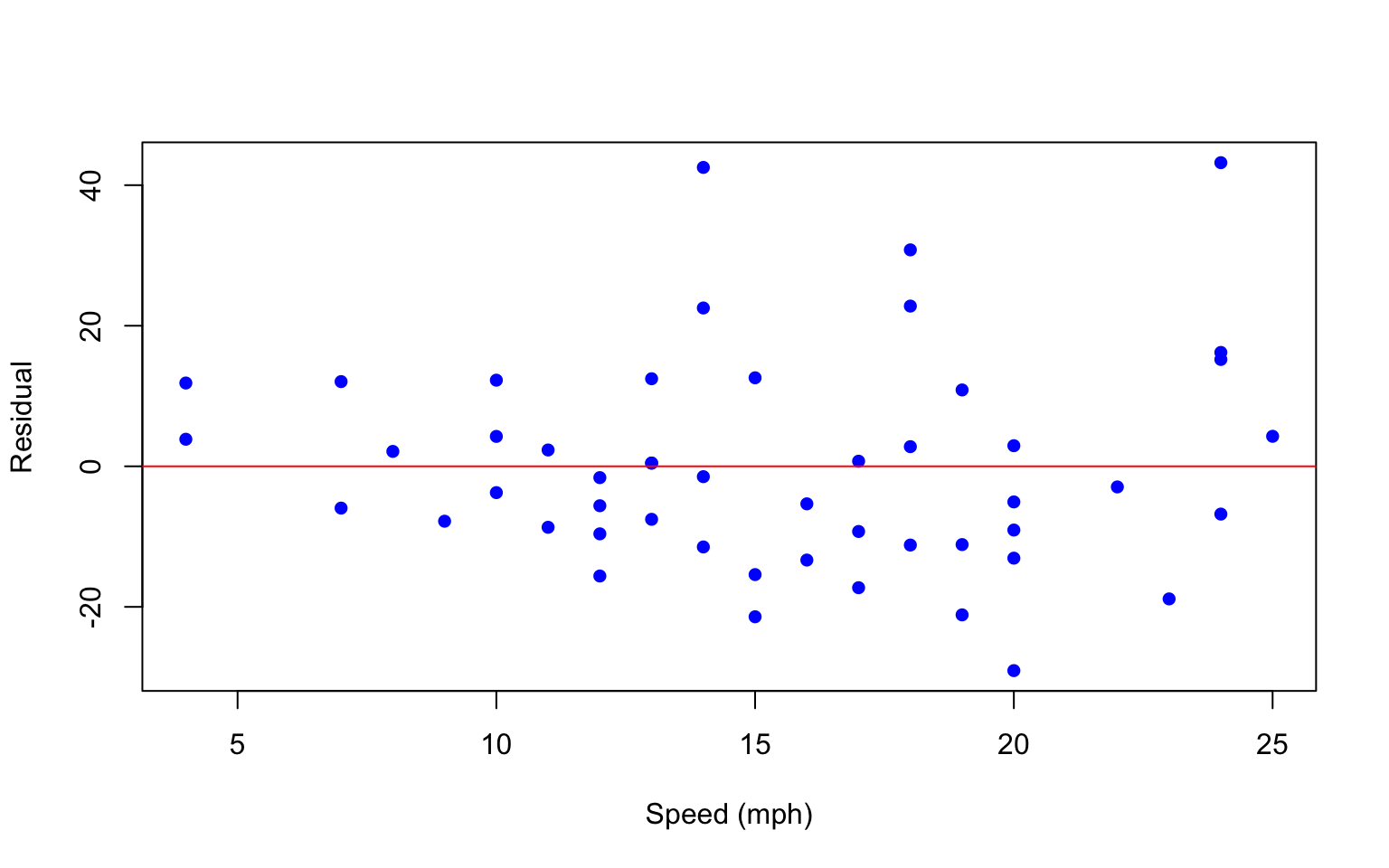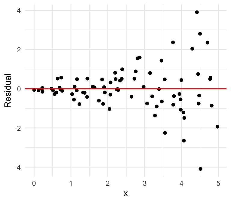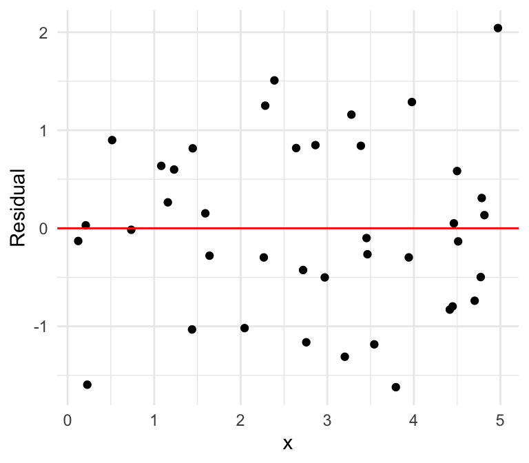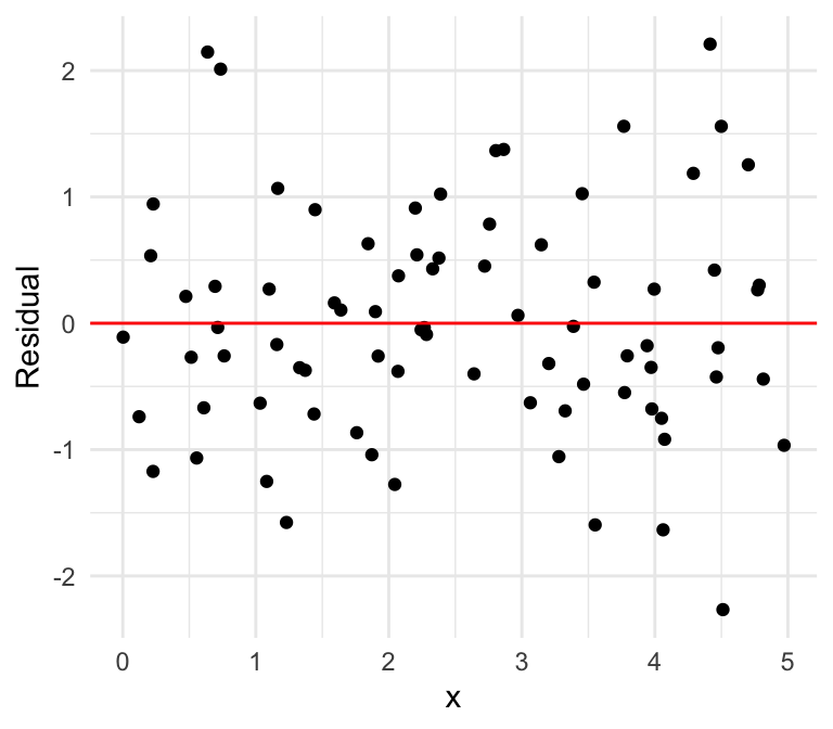 We can also plot the residuals against our independent variable, where we define the residual as follows: \[\widehat{\epsilon}_i = \mathrm{Residual} = \mathrm{Observed} - \mathrm{Predicted}=y -\widehat{y}\]