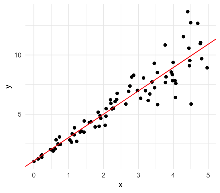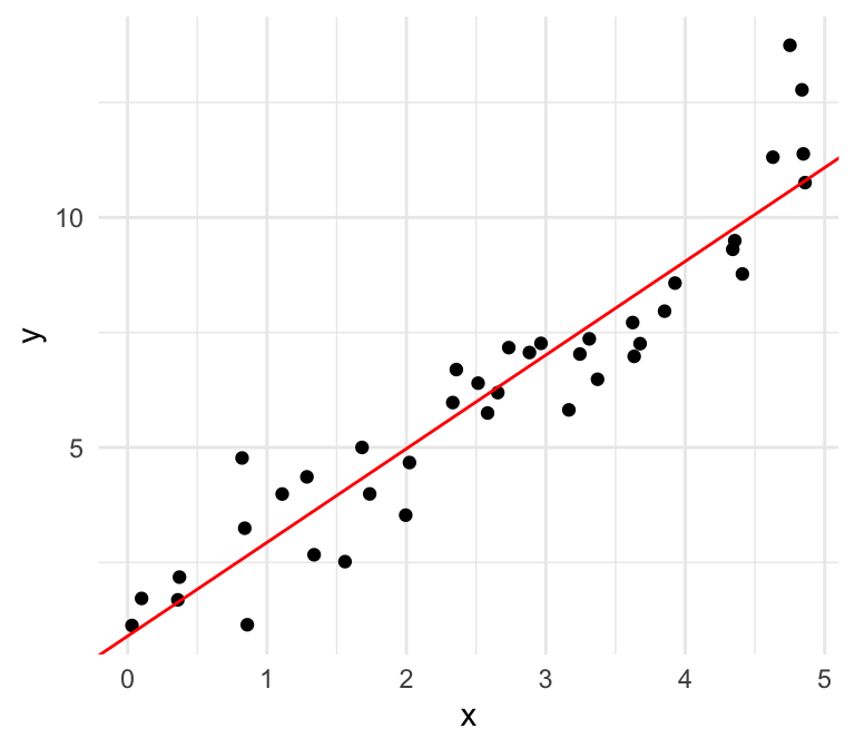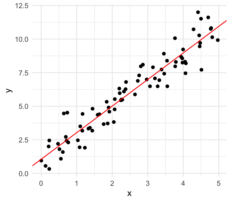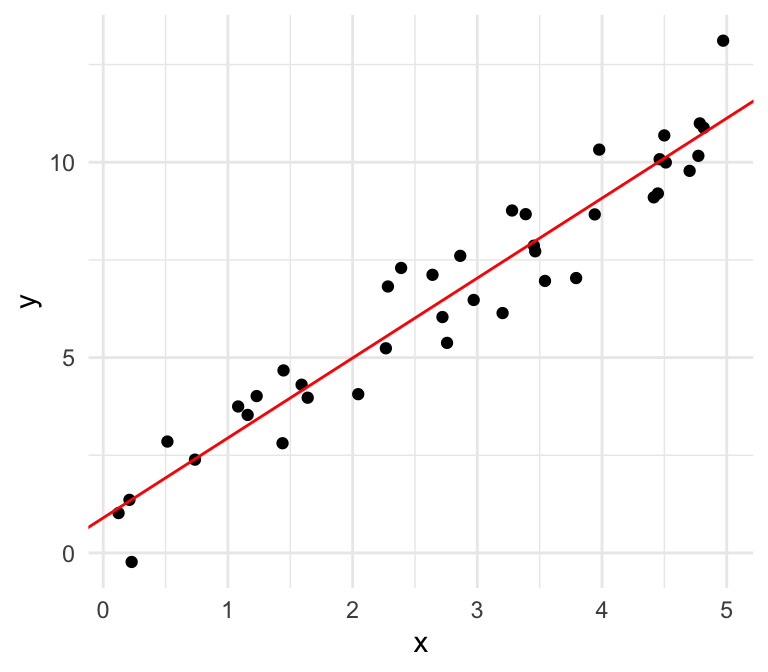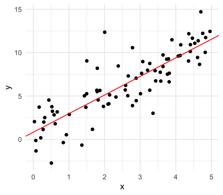 Least squares finds the line that minimizes the squared distance between the points and the line, i.e. makes \[\left[y_i - (\beta_0 + \beta_1 x_{i, 1} + \dots + \beta_k x_{i,k})\right]^2\] as small as possible for all \(i = 1, \dots, n\).