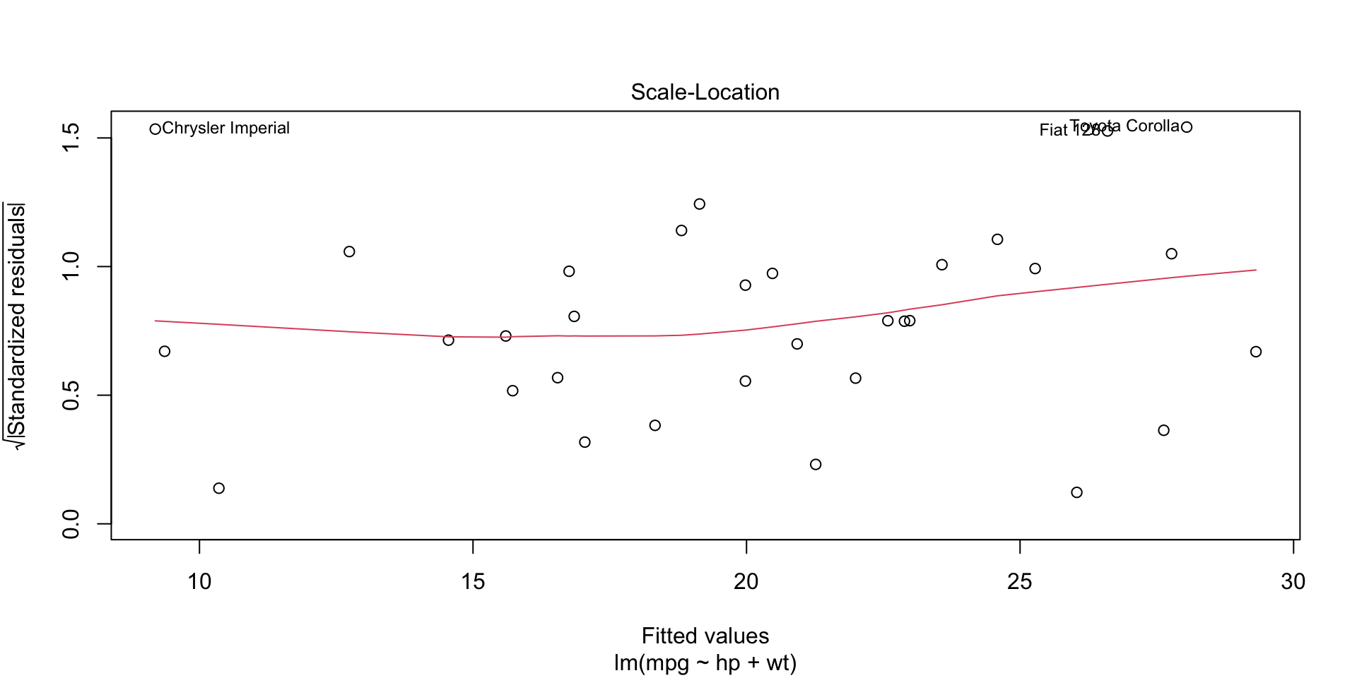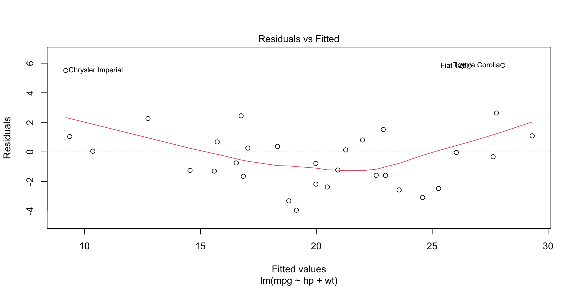 theme(plot.title = element_text(hjust = 0.5))fitted() Extract fitted valuespredict(): Predict new outcomesUse predict() to predict new outcomes given new explanatory variables. For example, pretend we observe two new cars with horsepowers of 100 and 150, respectively, and weights of 3000 and 3500, respectively.