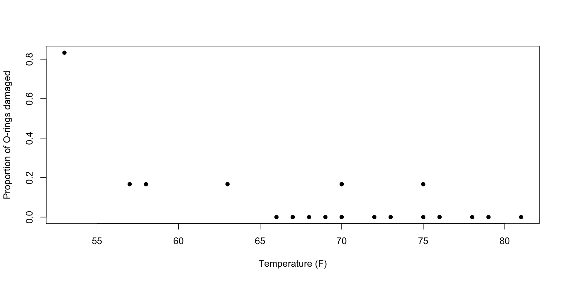 plot((damaged /6) ~ temperature, data = orings, pch =16,ylab ="Proportion of O-rings damaged", xlab ="Temperature (F)")