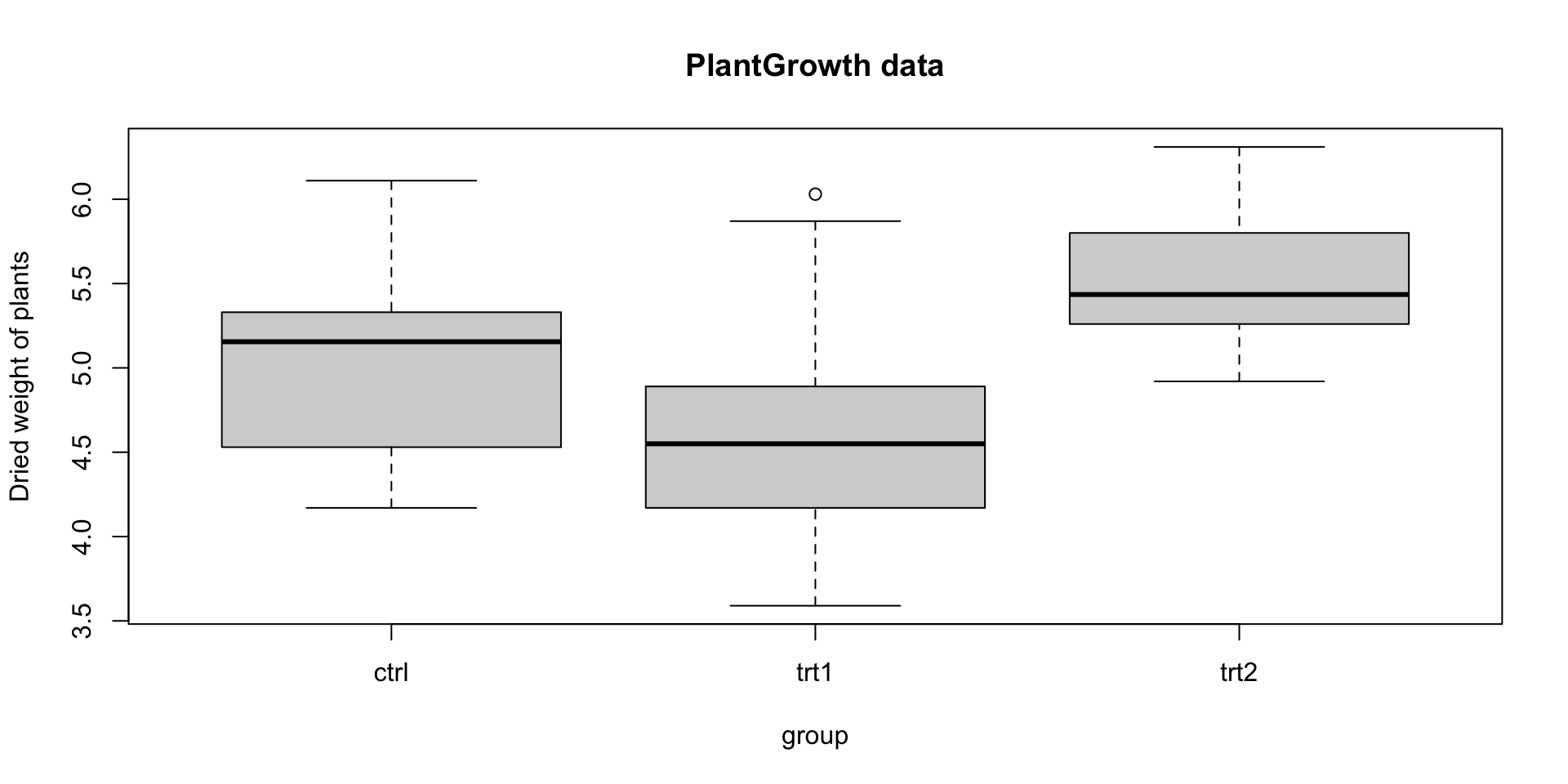boxplot(weight ~ group, data = PlantGrowth, main ="PlantGrowth data",ylab ="Dried weight of plants", col ="lightgray")