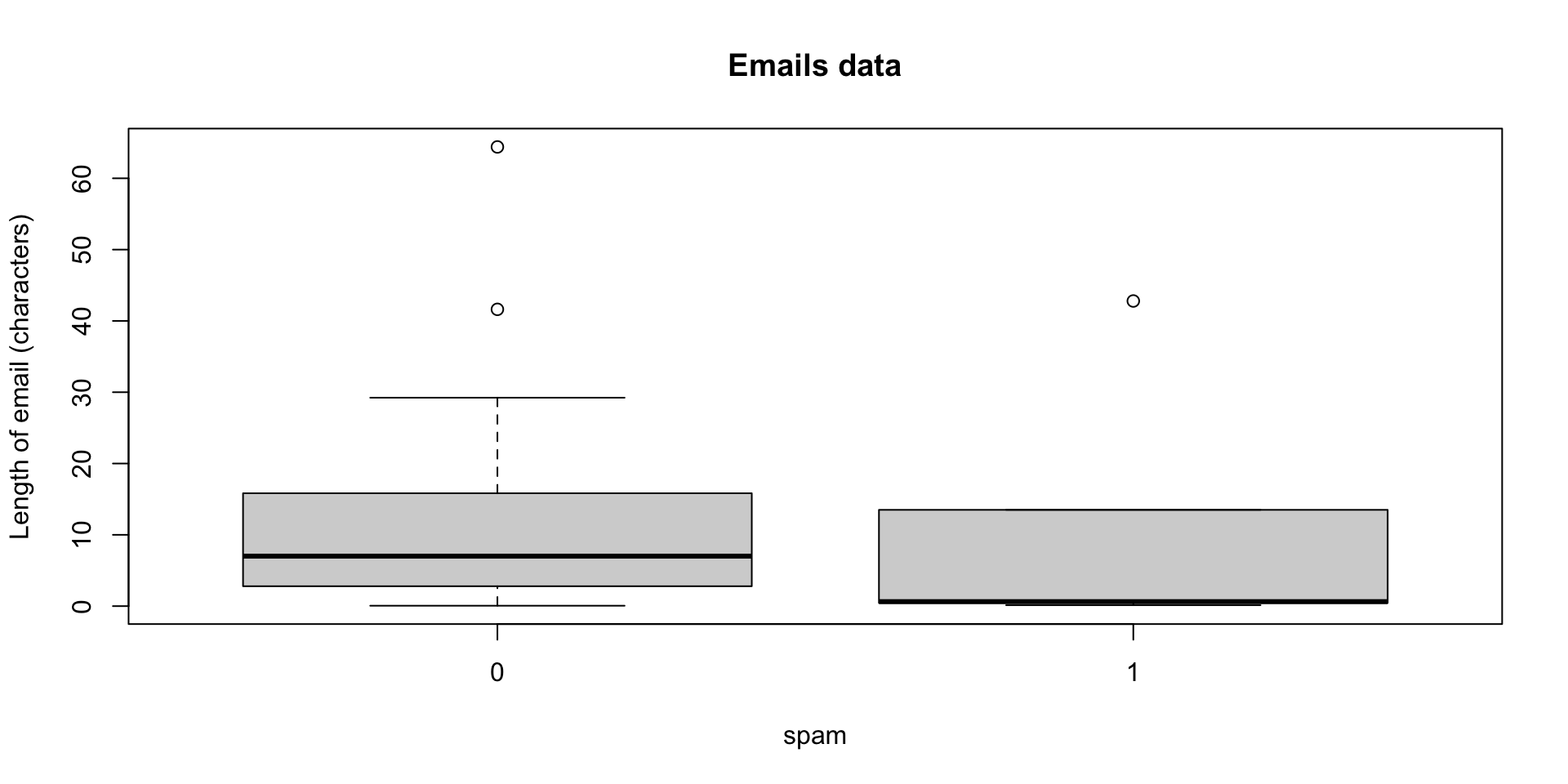 emails <-read.csv("https://www.openintro.org/data/csv/email50.csv")boxplot(num_char ~ spam, data = emails, main ="Emails data",ylab ="Length of email (characters)", col ="lightgray")
