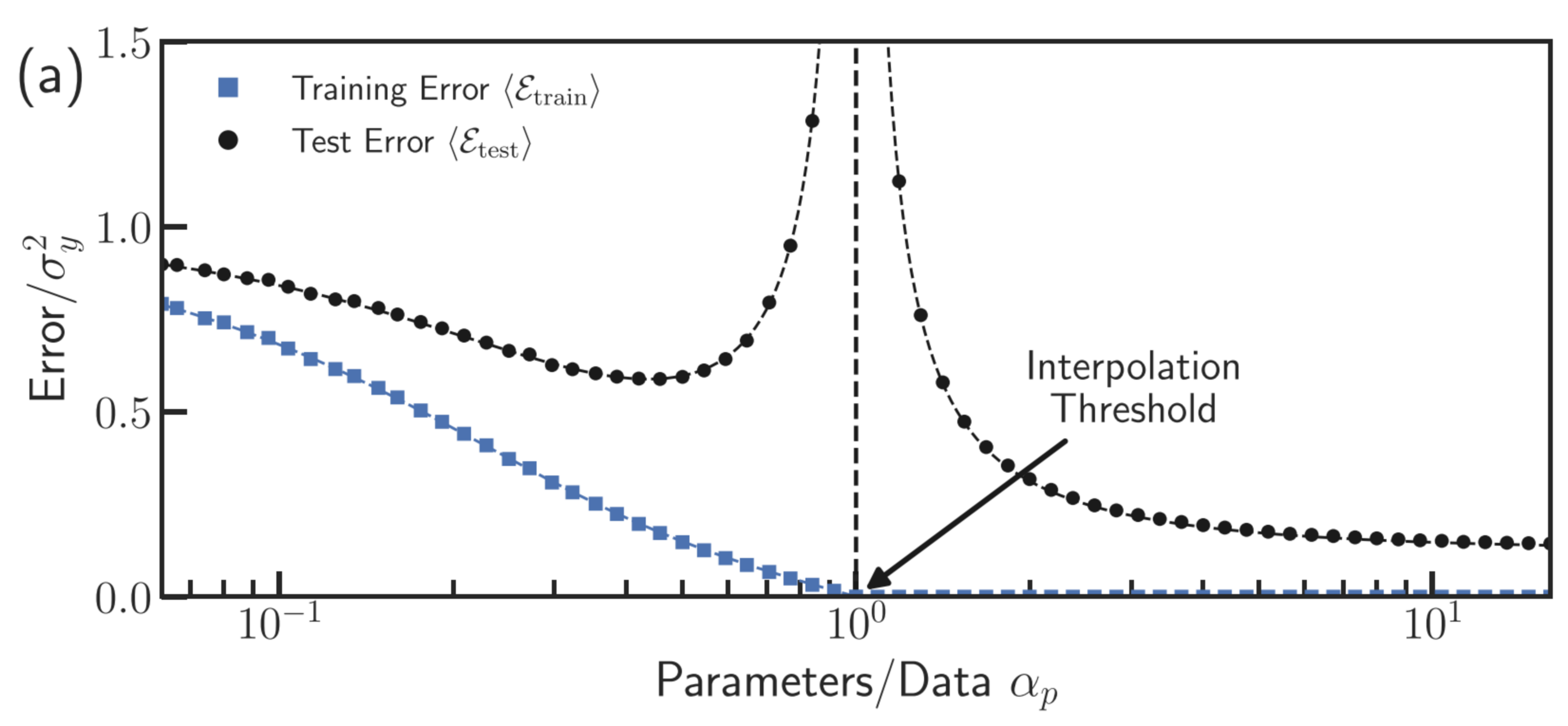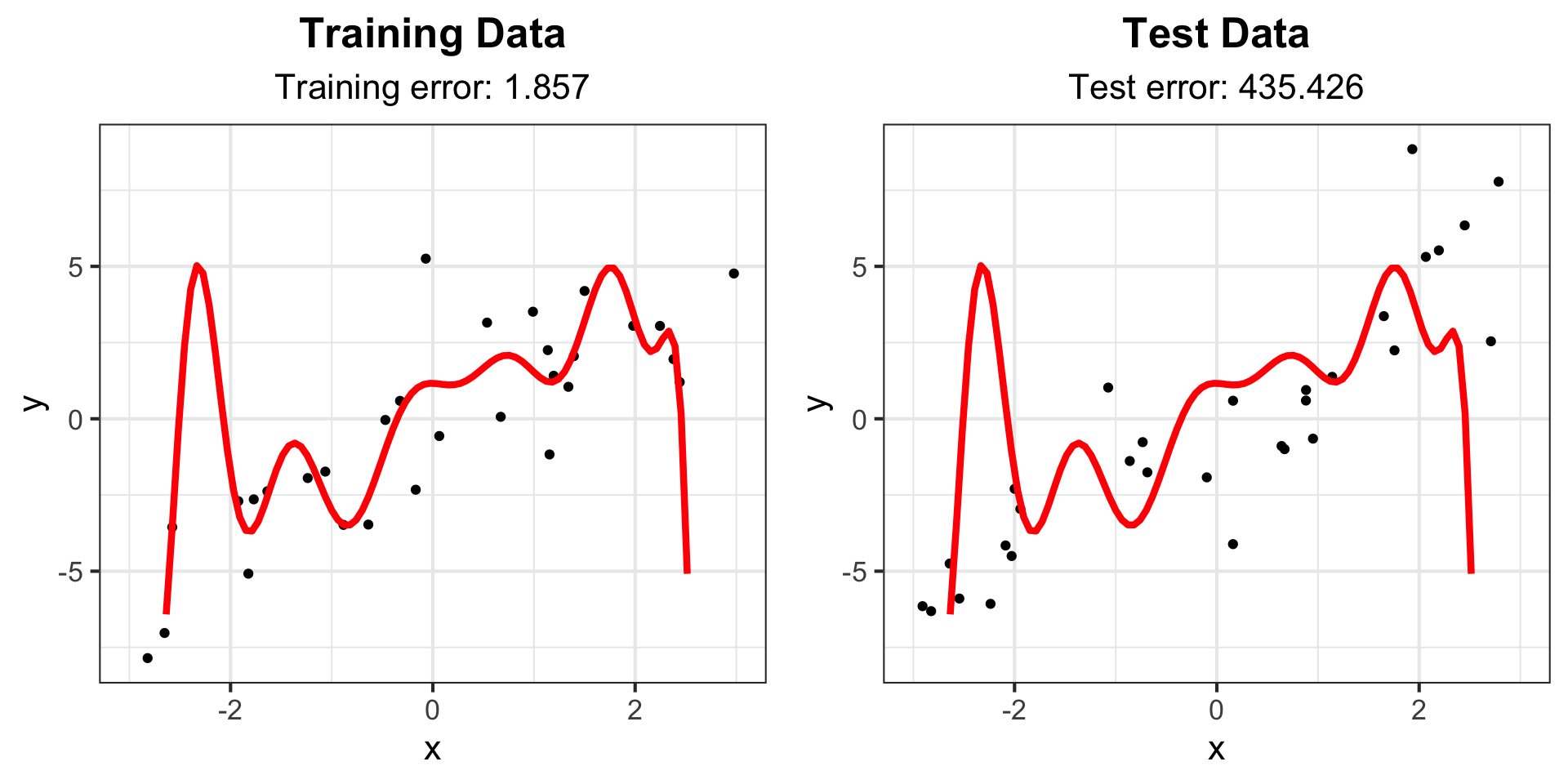 # Fit 15 degree polynomial and calculate training errorlm_fit_15 <-lm(y ~poly(x, 15), data = df_train)yhat_train_15 <-predict(lm_fit_15)train_err_15 <-mean((df_train$y - yhat_train_15)^2)# Calculate testing erroryhat_test_15 <-predict(lm_fit_15, data.frame(x = df_test$x))test_err_15 <-mean((df_test$y - yhat_test_15)^2)# Create smooth line for plottingx_fit <-data.frame(x =seq(-3, 3, length =100))line_fit <-data.frame(x = x_fit, y =predict(lm_fit_15, newdata = x_fit))# Add linear model and error text to plotg_train5 <- g_train +labs(subtitle =paste("Training error:", round(train_err_15, 3))) +geom_line(data = line_fit, aes(y = y, x = x), col ="red", lwd =1.5)g_test5 <- g_test +labs(subtitle =paste("Test error:", round(test_err_15, 3))) +geom_line(data = line_fit, aes(y = y, x = x), col ="red", lwd =1.5)ggarrange(g_train5, g_test5)