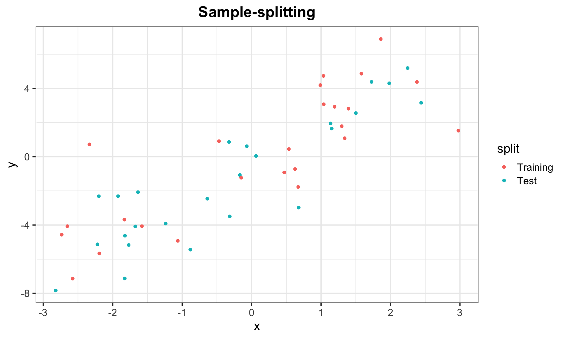 library(forcats)# Generate dataset.seed(302)n <-50x <-sort(runif(n, -3, 3))y <-2*x +2*rnorm(n)# Randomly split data into two partsinds <-sample(rep(1:2, length = n))split <-as.factor(inds) |>fct_recode(Training ="1", Test ="2")data <-data.frame("x"= x, "y"= y, "split"= split)g_split <-ggplot(data, aes(x = x, y = y, color = split)) +geom_point() +labs(title ="Sample-splitting") + my_themeg_split