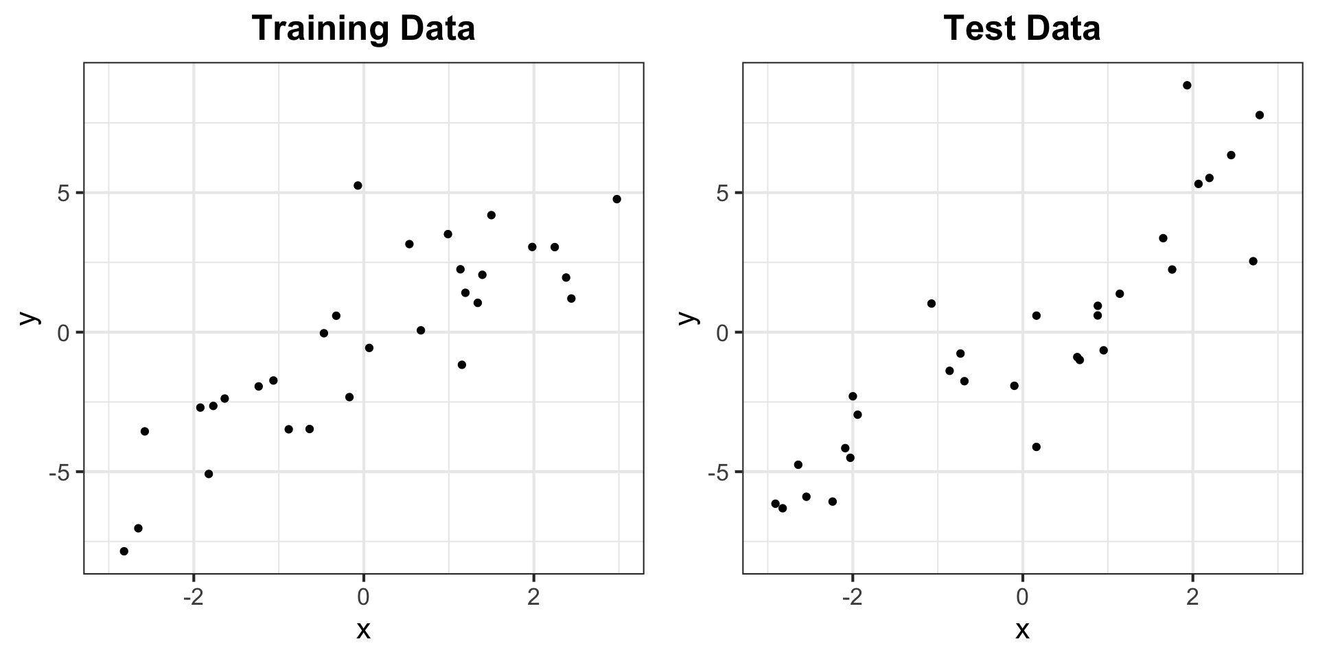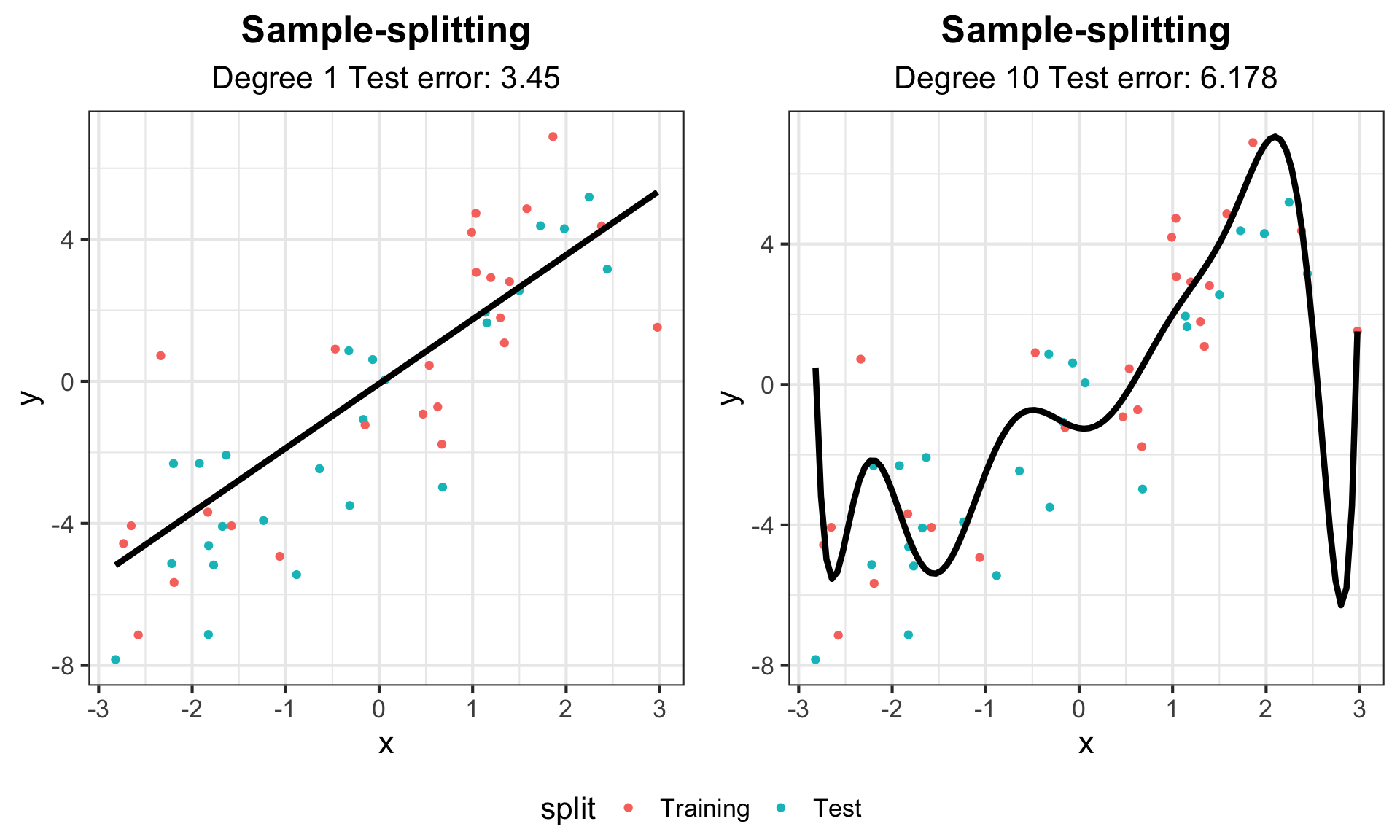 # Train on the training splitdata_train <- data |> dplyr::filter(split =="Training")lm_1 <-lm(y ~ x, data = data_train)lm_10 <-lm(y ~poly(x, 10), data = data_train)# Predict on the second halfdata_test <- data |> dplyr::filter(split =="Test")pred_1 <-predict(lm_1, data.frame(x = data_test$x))pred_10 <-predict(lm_10, data.frame(x = data_test$x))# Calculate test errortest_err_1 <-mean((data_test$y - pred_1)^2)test_err_10 <-mean((data_test$y - pred_10)^2)