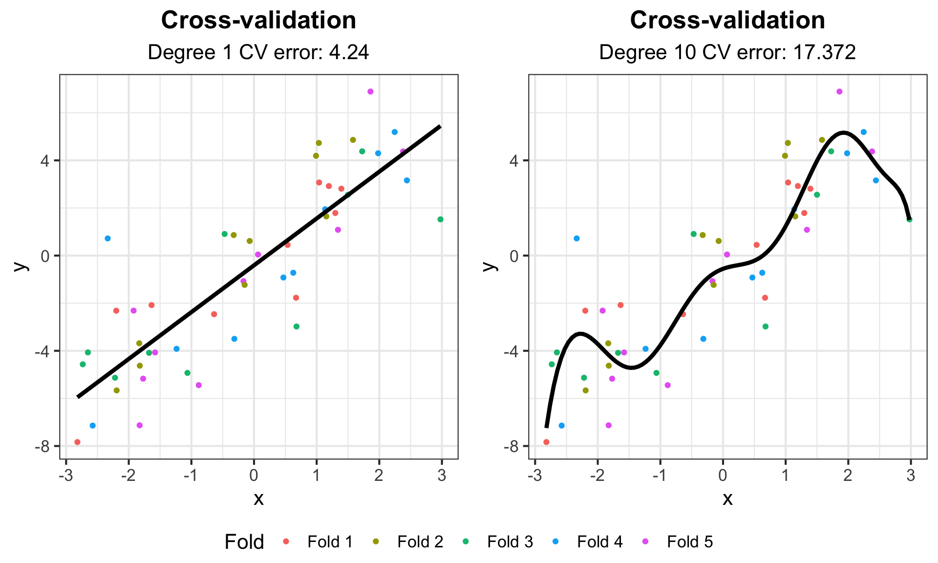 # Create predictive modellm_1 <-lm(y ~ x, data = data)lm_10 <-lm(y ~poly(x, 10), data = data)# Create smooth lines for plottingx_fit <-data.frame(x =seq(min(data$x), max(data$x), length =100))line_fit_1 <-data.frame(x = x_fit, y =predict(lm_1, newdata = x_fit))line_fit_10 <-data.frame(x = x_fit, y =predict(lm_10, newdata = x_fit))# Recode split for legenddata <- data |>mutate(Fold =fct_recode(as.factor(split), "Fold 1"="1", "Fold 2"="2","Fold 3"="3", "Fold 4"="4", "Fold 5"="5"))g_cv <-ggplot(data, aes(x = x, y = y, color = Fold)) +geom_point() +labs(title ="Cross-validation") + my_themeg_cv1 <- g_cv +labs(subtitle =paste("Degree 1 CV error:", round(cv_err[1], 3))) +geom_line(data = line_fit_1, aes(y = y, x = x), col ="black", lwd =1.5)g_cv10 <- g_cv +labs(subtitle =paste("Degree 10 CV error:", round(cv_err[2], 3))) +geom_line(data = line_fit_10, aes(y = y, x = x), col ="black", lwd =1.5)ggarrange(g_cv1, g_cv10, common.legend =TRUE, legend ="bottom")