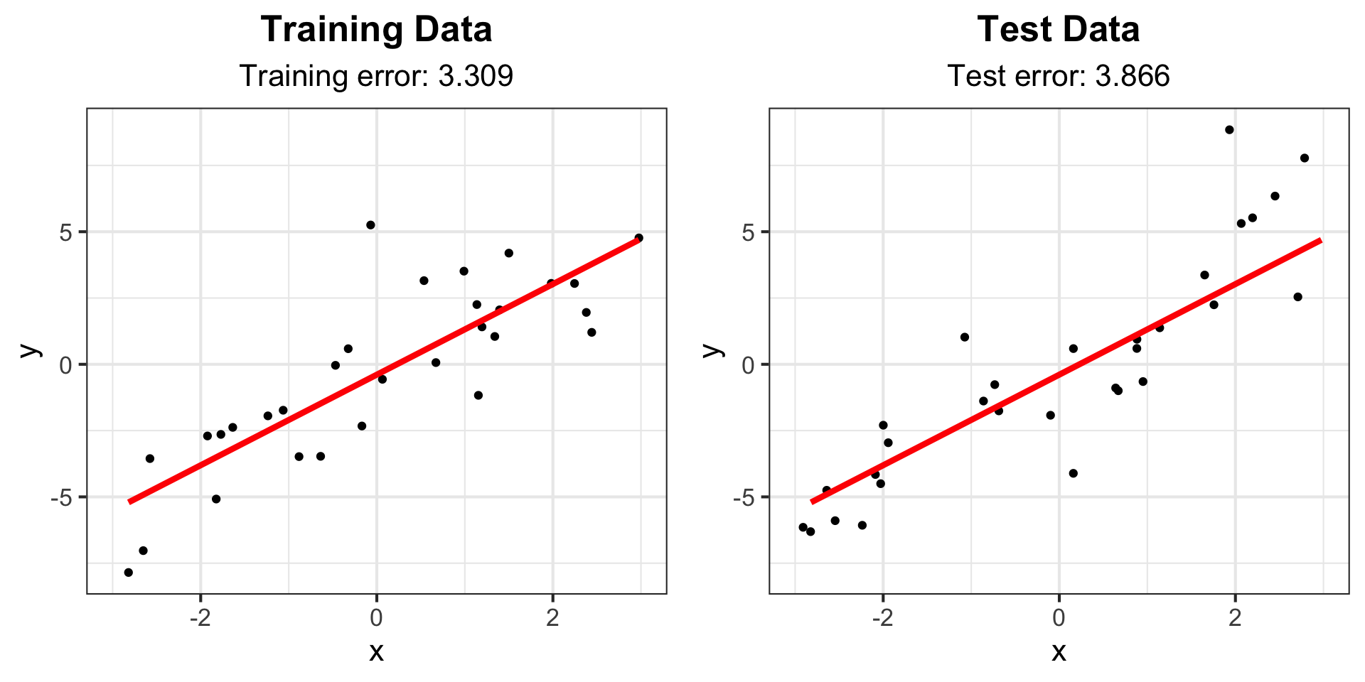 # Fit linear model and calculate training errorlm_fit <-lm(y ~ x, data = df_train)yhat_train <-predict(lm_fit)# (y_i - yhat_i)^2train_err <-mean((df_train$y - yhat_train)^2)# Calculate testing erroryhat_test <-predict(lm_fit, data.frame(x = df_test$x))test_err <-mean((df_test$y - yhat_test)^2)# Add linear model and error text to plotg_train2 <- g_train +labs(subtitle =paste("Training error:", round(train_err, 3))) +geom_line(aes(y =fitted(lm_fit)), col ="red", lwd =1.5)g_test2 <- g_test +labs(subtitle =paste("Test error:", round(test_err, 3))) +geom_line(aes(y =fitted(lm_fit), x = df_train$x), col ="red", lwd =1.5)ggarrange(g_train2, g_test2)