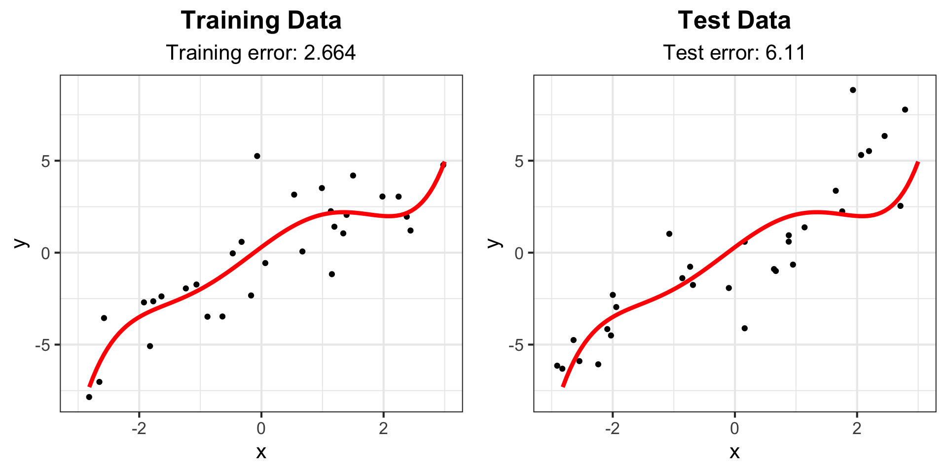 # Fit 5 degree polynomial and calculate training errorlm_fit_5 <-lm(y ~poly(x, 5), data = df_train)yhat_train_5 <-predict(lm_fit_5)train_err_5 <-mean((df_train$y - yhat_train_5)^2)# Calculate testing erroryhat_test_5 <-predict(lm_fit_5, data.frame(x = df_test$x))test_err_5 <-mean((df_test$y - yhat_test_5)^2)# Create smooth line for plottingx_fit <-data.frame(x =seq(-3, 3, length =100))line_fit <-data.frame(x = x_fit, y =predict(lm_fit_5, newdata = x_fit))# Add linear model and error text to plotg_train3 <- g_train +labs(subtitle =paste("Training error:", round(train_err_5, 3))) +geom_line(data = line_fit, aes(y = y, x = x), col ="red", lwd =1.5)g_test3 <- g_test +labs(subtitle =paste("Test error:", round(test_err_5, 3))) +geom_line(data = line_fit, aes(y = y, x = x), col ="red", lwd =1.5)ggarrange(g_train3, g_test3)