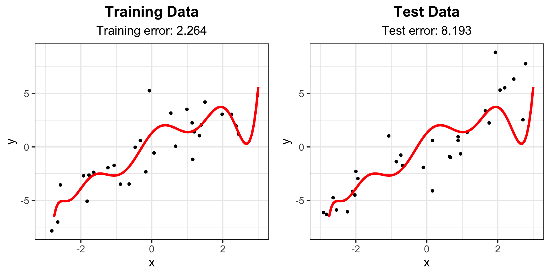 # Fit 10 degree polynomial and calculate training errorlm_fit_10 <-lm(y ~poly(x, 10), data = df_train)yhat_train_10 <-predict(lm_fit_10)train_err_10 <-mean((df_train$y - yhat_train_10)^2)# Calculate testing erroryhat_test_10 <-predict(lm_fit_10, data.frame(x = df_test$x))test_err_10 <-mean((df_test$y - yhat_test_10)^2)# Create smooth line for plottingx_fit <-data.frame(x =seq(-3, 3, length =100))line_fit <-data.frame(x = x_fit, y =predict(lm_fit_10, newdata = x_fit))# Add linear model and error text to plotg_train4 <- g_train +labs(subtitle =paste("Training error:", round(train_err_10, 3))) +geom_line(data = line_fit, aes(y = y, x = x), col ="red", lwd =1.5)g_test4 <- g_test +labs(subtitle =paste("Test error:", round(test_err_10, 3))) +geom_line(data = line_fit, aes(y = y, x = x), col ="red", lwd =1.5)ggarrange(g_train4, g_test4)