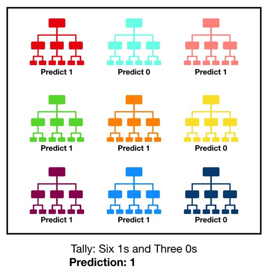 In practice, we don’t typically predict with a single tree. Instead, we combine multiple trees and take the average/most common of their predictions. Keeping with the tree metaphor, this is referred to as the random forest algorithm.